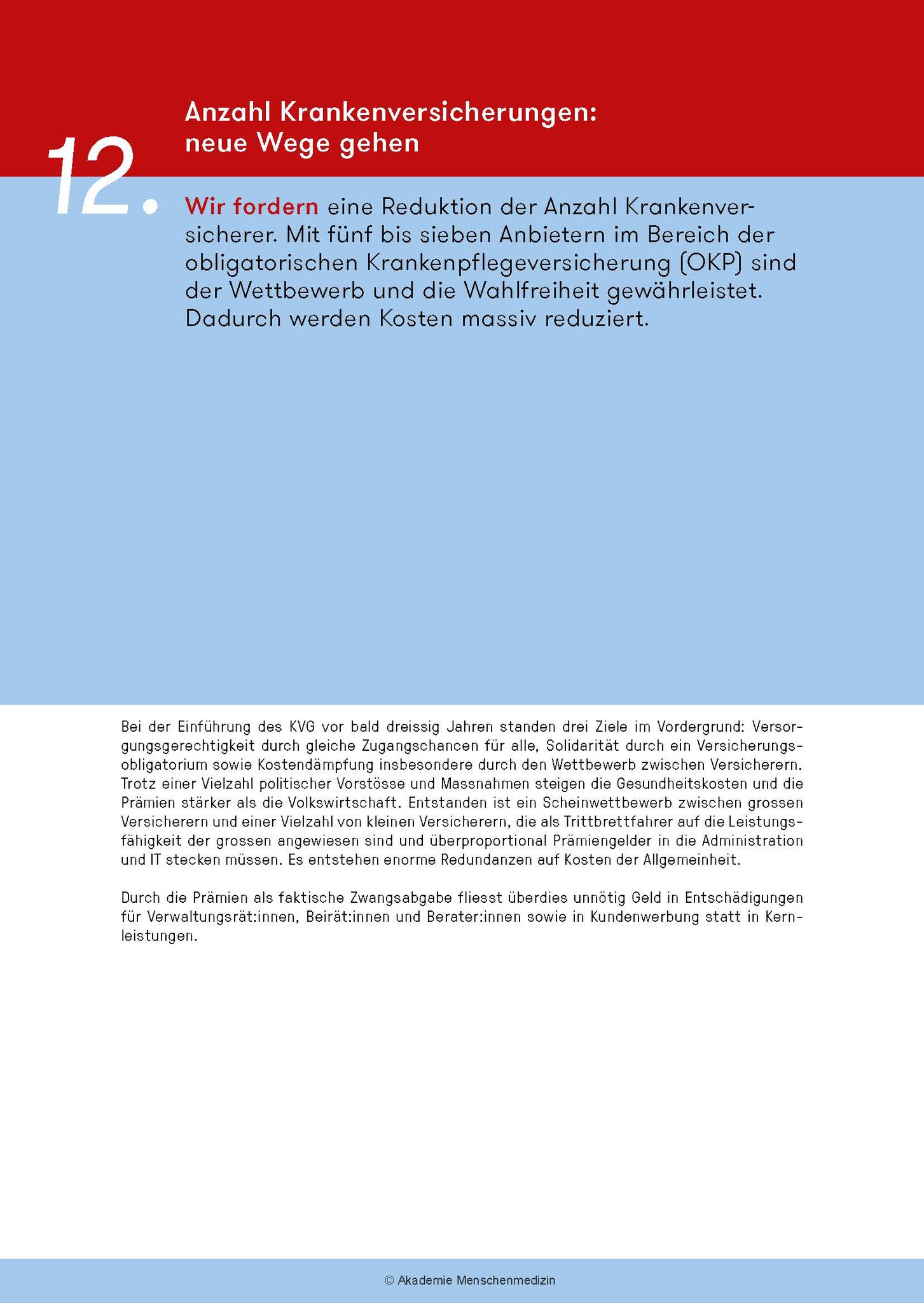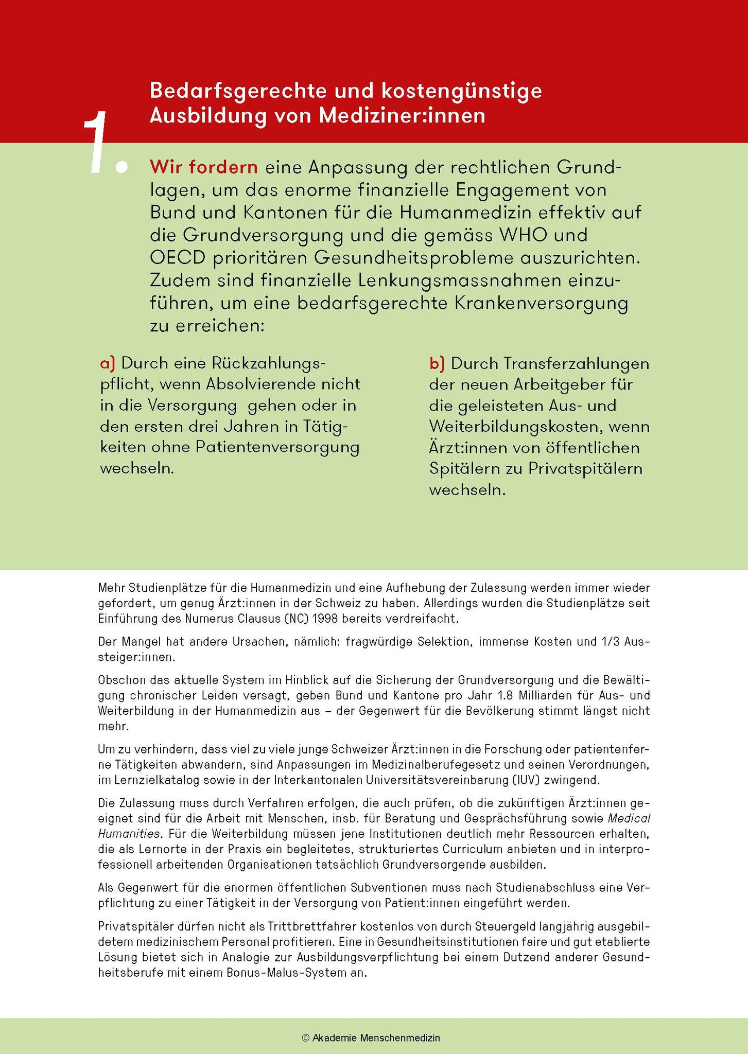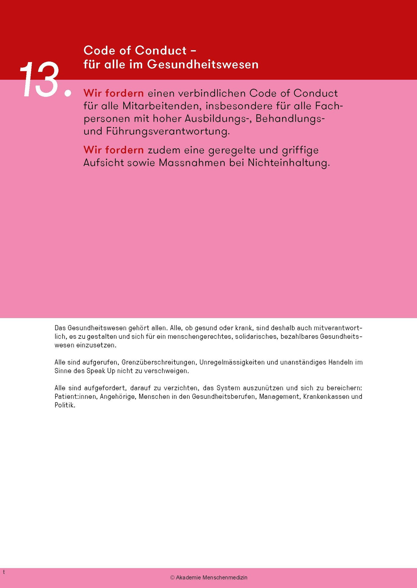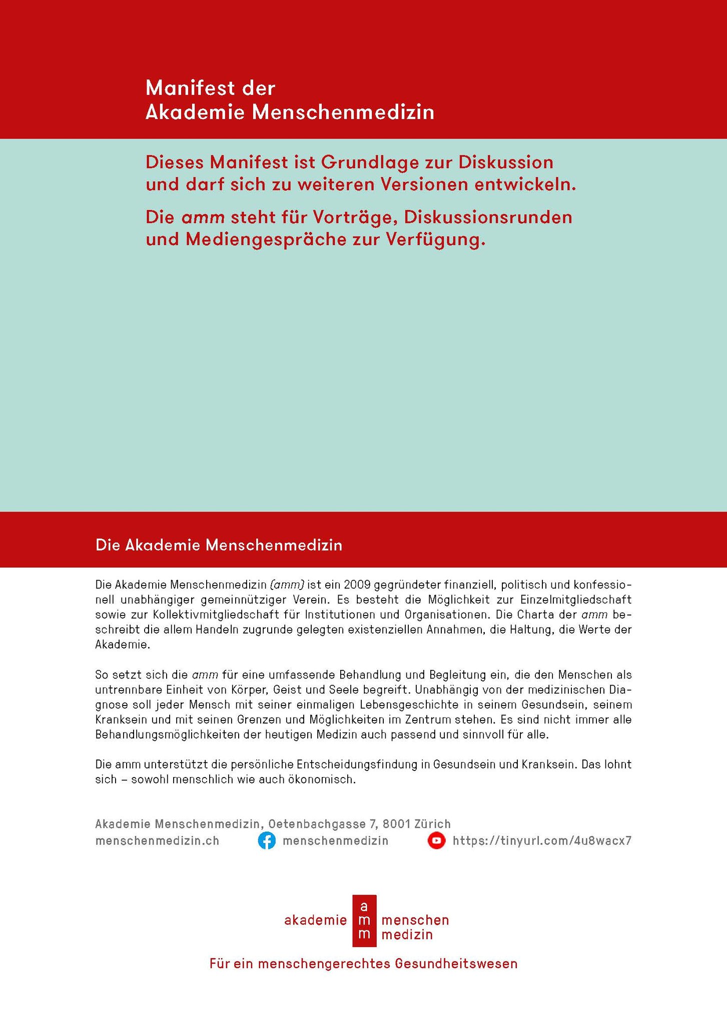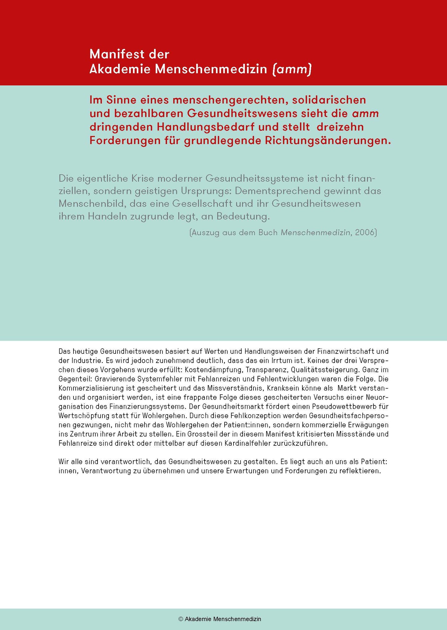 Das amm-Manifest fordert ein grundlegendes Umdenken: Bei der Aus- und Weiterbildungen, die bedarfsgerechter und kostengünstiger werden müssen, bei den Gesundheitsdaten und bei der Digitalisierung, bei den Krankenkassen u.a.m. Am Abschied von einer Sichtweise, die das Gesundheitswesen als Markt und medizinische Leistungen als Konsumgüter missversteht, führt kein Weg vorbei. Zudem muss neu ein Code of Conduct für alle im Gesundheitswesen Tätigen gelten.
