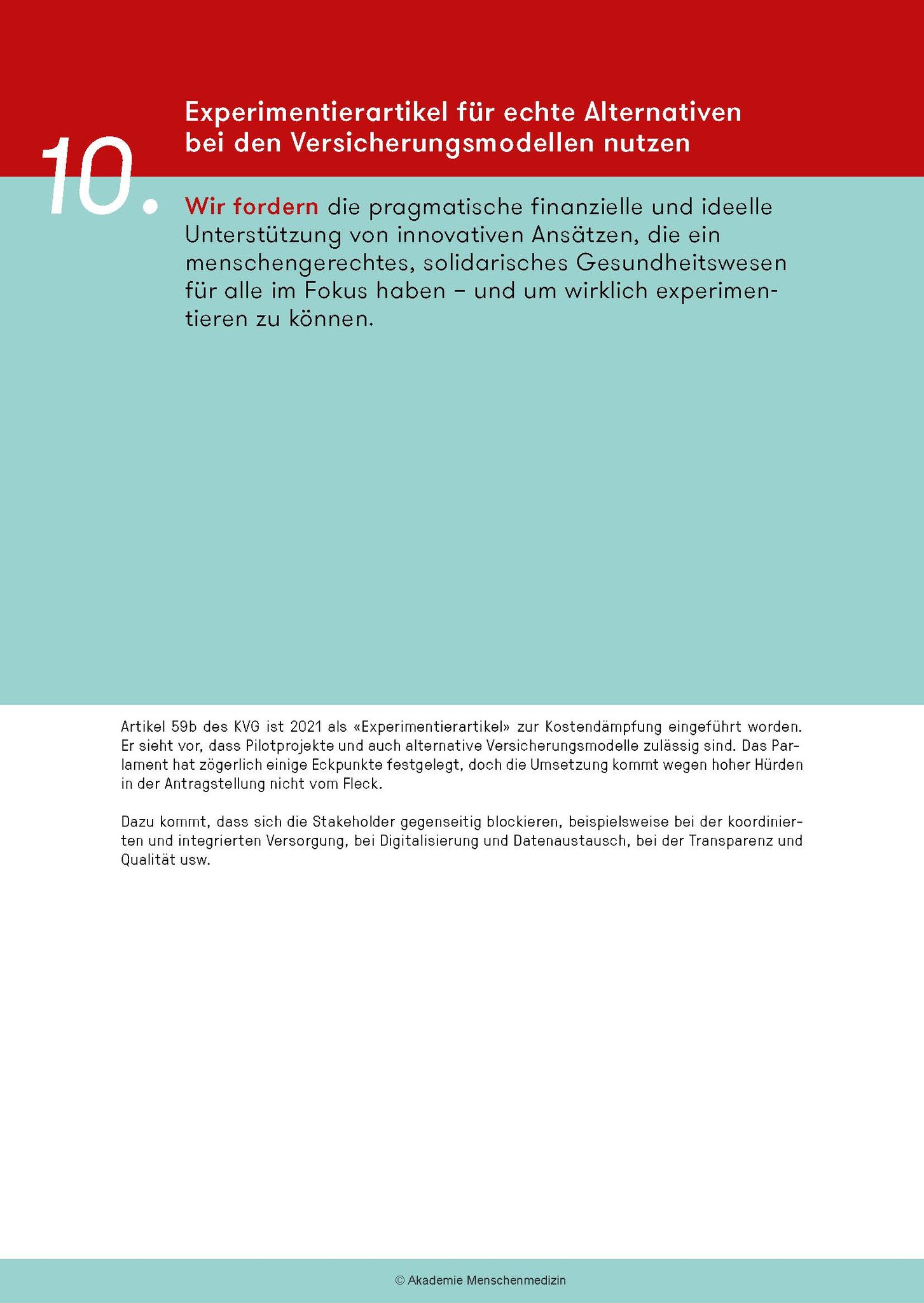 Bausteine zu einem menschengerechten Gesundheitswesen beitragen können. Zum Teil können dafür bestehende Instrumente genutzt werden, etwa der sogenannte Experimentierartikel (Art. 59b KVG): Er würde es erlauben, kreative Ansätze zur Qualitätssteigerung und/oder Kostensenkung unbürokratisch zu testen, wird aber –